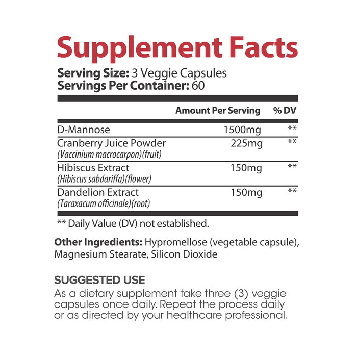 - Comprehensive Blend: 2000mg per serving of Cranberry, D-Mannose, Hibiscus, and Dandelion Extract.