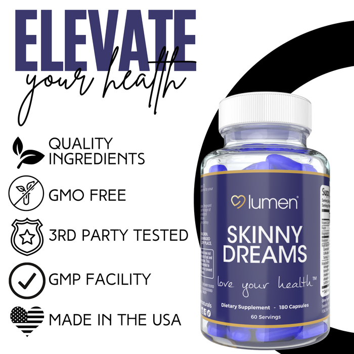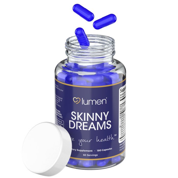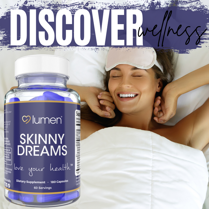 Discover a new addition to your nighttime routine with Lumen Naturals SkinnyDream Supplement for Women. This night blend is designed to complement your evening regimen, featuring essential nutrients like Vitamin C, Niacin, and Magnesium, along with Melatonin. Each bottle contains 180 capsules, providing 60 servings that seamlessly integrate into your daily life, helping you to unwind at night.